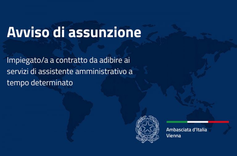 Si informa che la Rappresentanza Permanente d’Italia presso le Organizzazioni Internazionali in Vienna ha indetto una procedura di selezione per l’assunzione di n.1 impiegato/a da adibire ai servizi di assistente amministrativo, con contratto a tempo indeterminato.